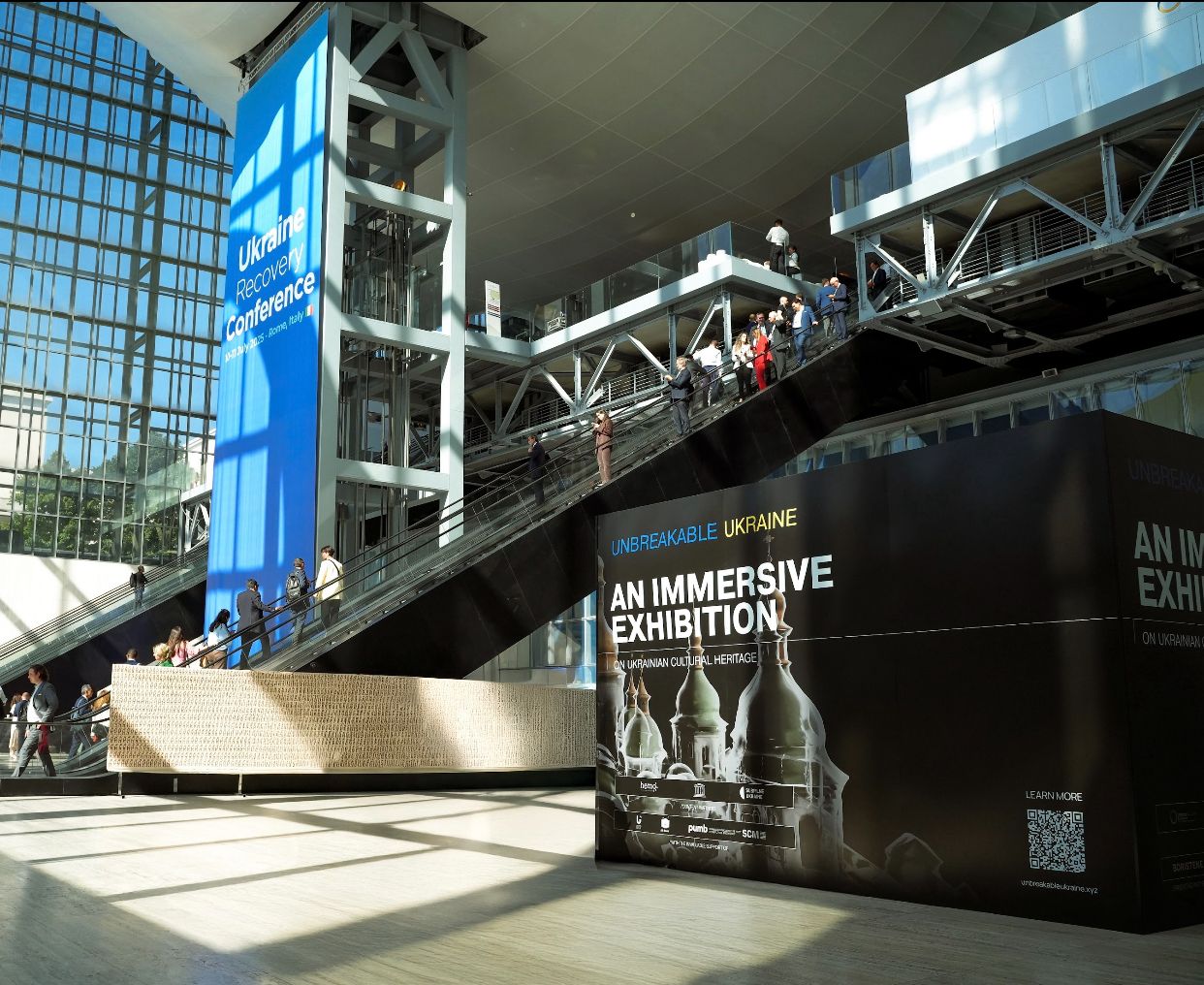 During the Ukraine Recovery Conference in Rome, we presented our project UNBREAKABLE UKRAINE, an immersive experience highlighting the strength and resilience of Ukrainian culture. Visitors embarked on a journey through five symbolic sites, including Saint Sophia Cathedral in Kyiv and Karazin University in Kharkiv, brought vividly to life through 3D scans, animations, and soundscapes.